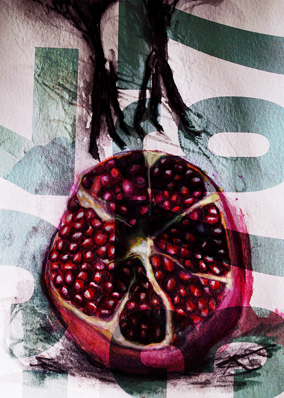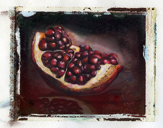 From Pomegranate and the Egg Series; Self Portrait, 2019, watercolours, pomegranate juice, coloured pencils, digital photography, digital painting, 5 x 7".