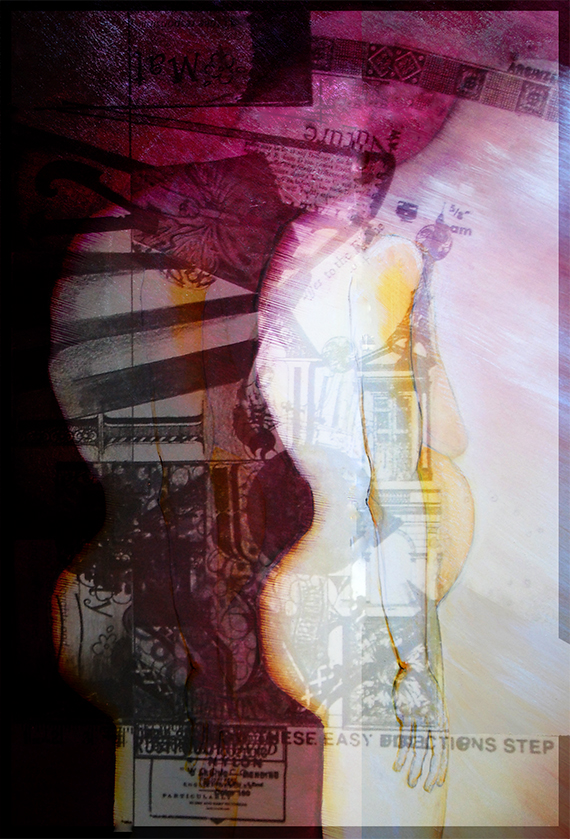 Science vs Romance Series: Shin: Device for finding furniture in the dark, 2018, oil, rice paper, graphite, ink, collage on paper, digital photography and digital painting, 3 x 4'.