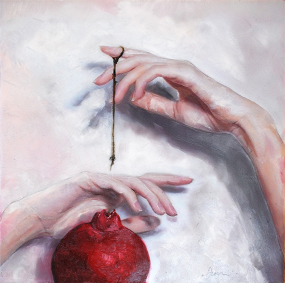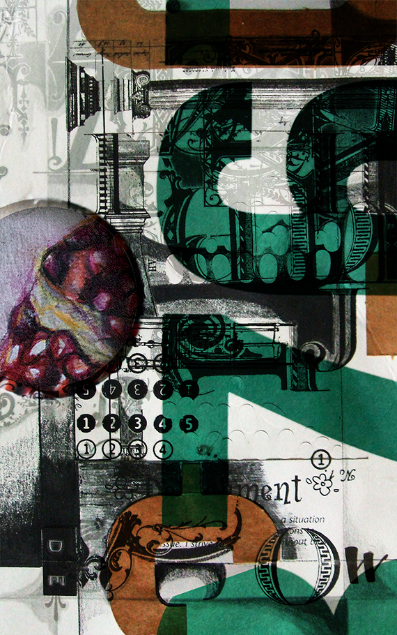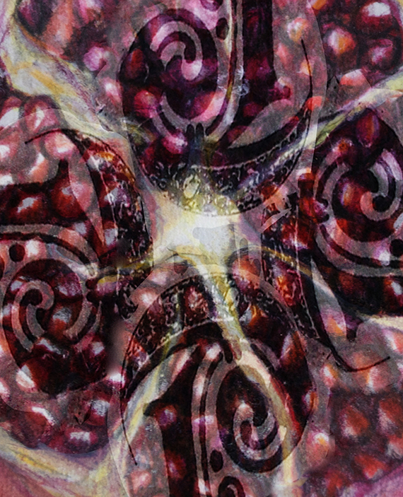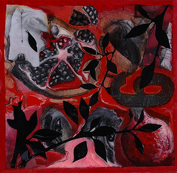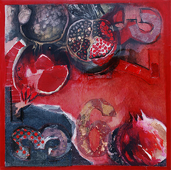 From Pomegranate and the Egg Series; 67, 2019, ink, oil, collage, resin on board, 12 x 12".