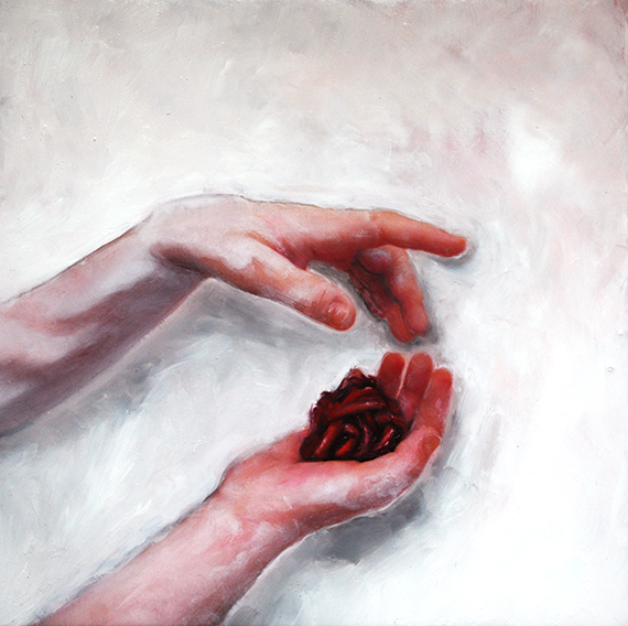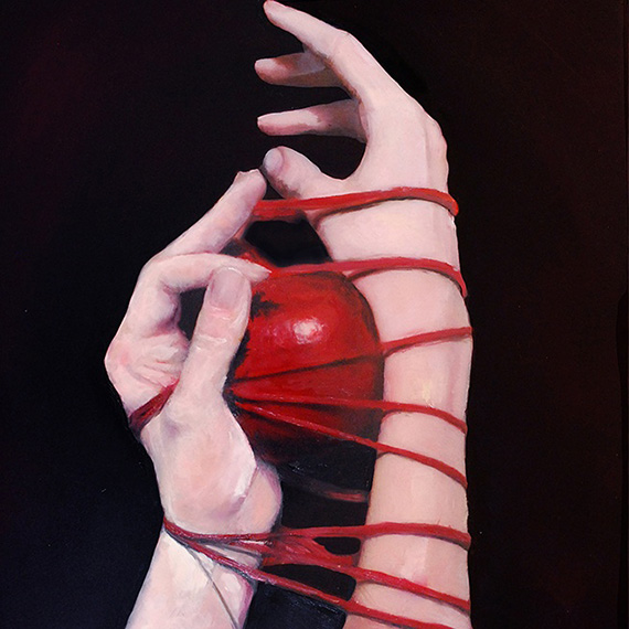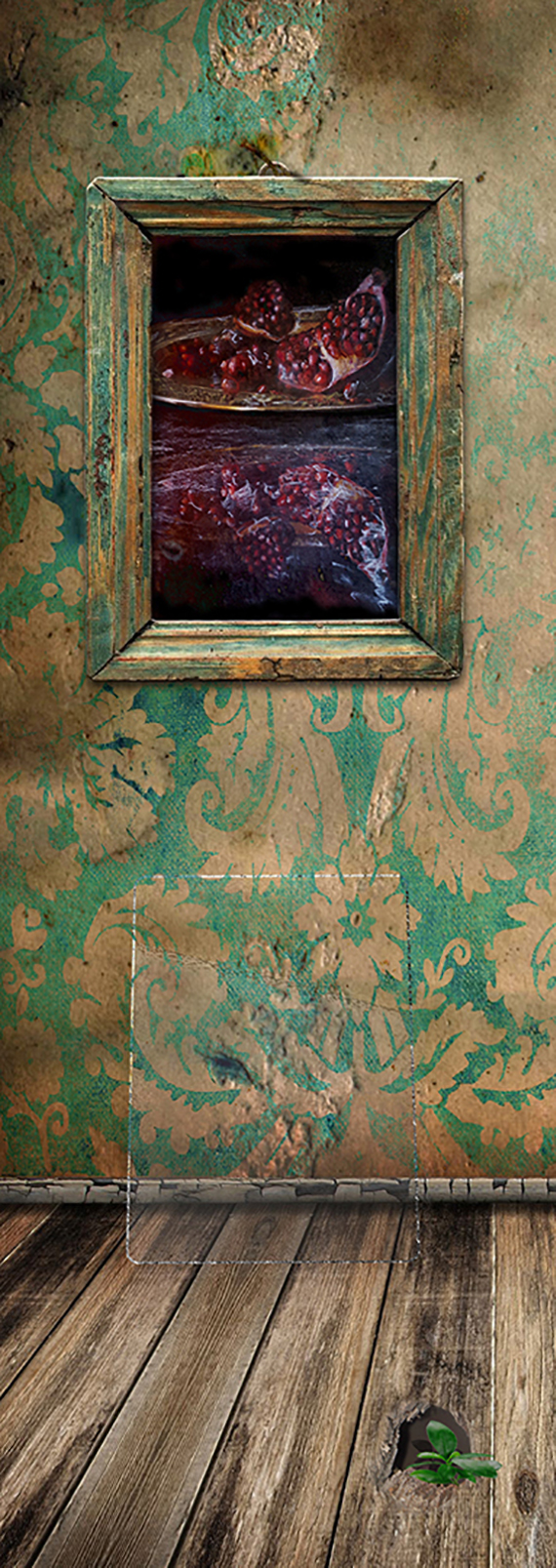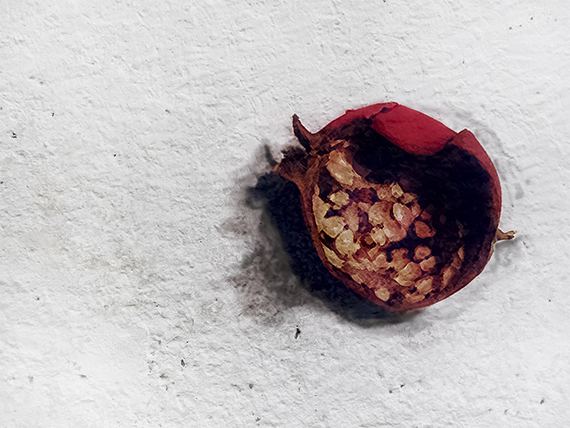 Character Deception, 2016, oil paint, pomegranate skin and graphite on wall, 12 x 8".