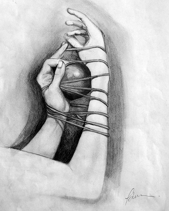 From Pomegranate and the Egg Series; Self Portrait, 2017, coloured pencils, paint, digital photography, digital painting, 36 x 30".